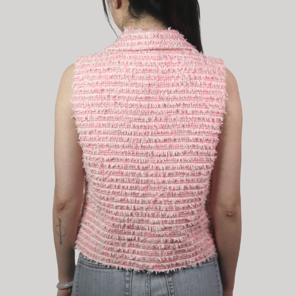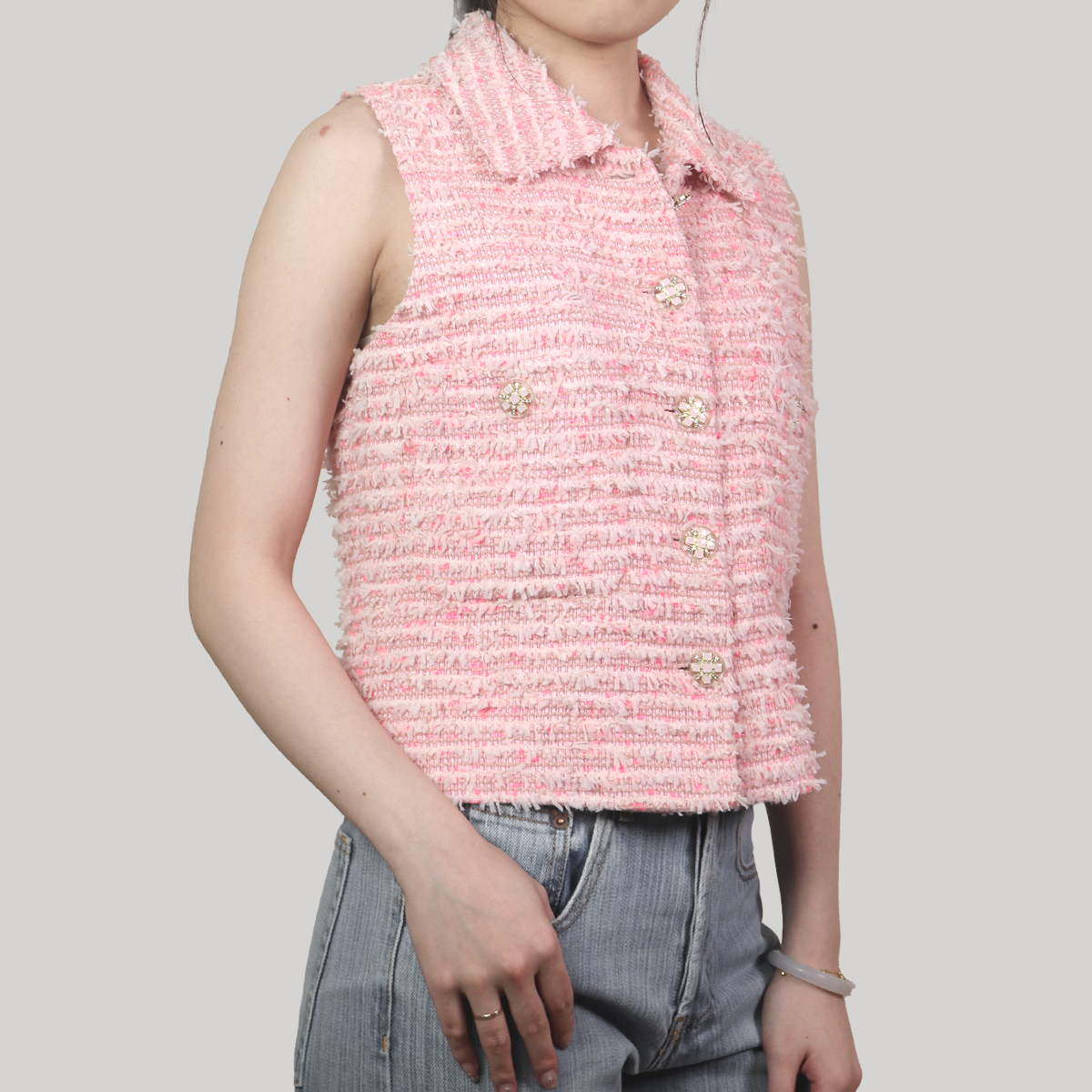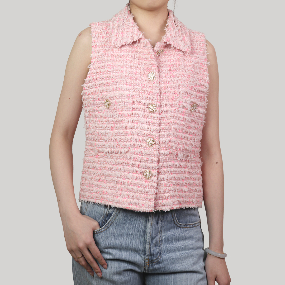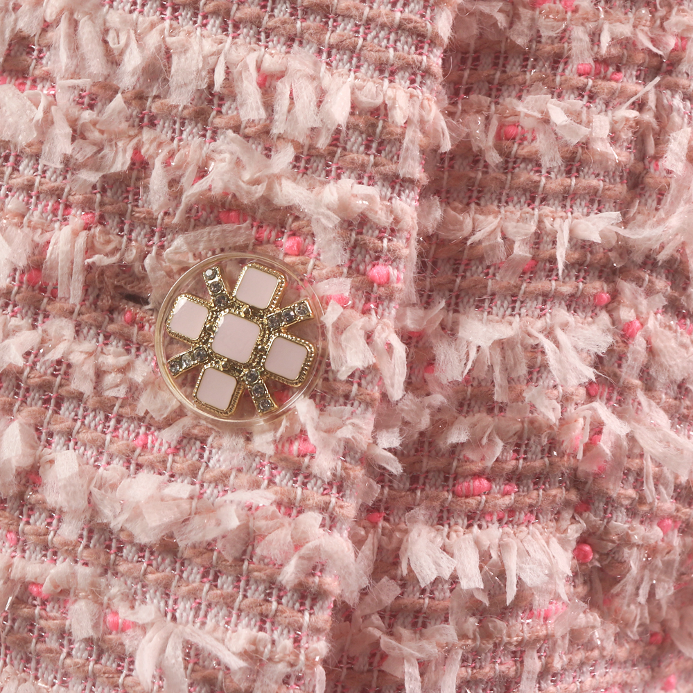 【rosa】鮮やかなピンクのフローラルツイードが若々しいエネルギーを放ち、ラペルデザインとダブルチェストポケットがエレガントなシルエットを表現します。シャネルの定番ウィンドミルクラスプが、甘さとフォーマルさの絶妙なバランスを実現し、普段使いにエレガントな活力を添えます。