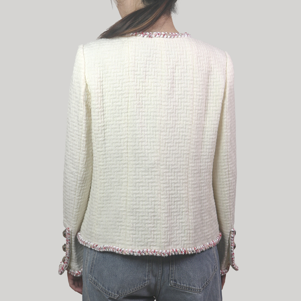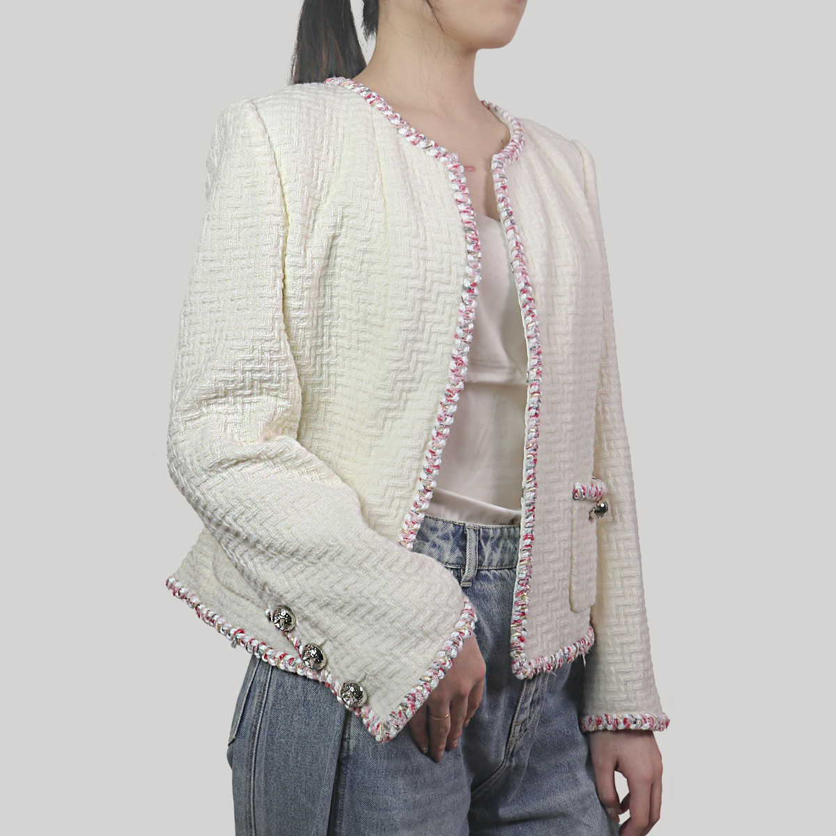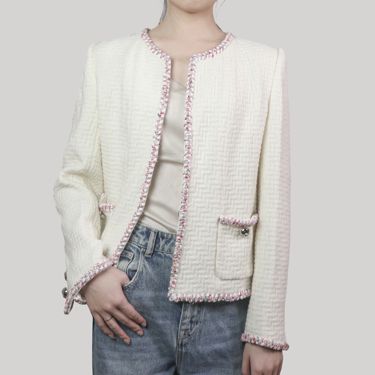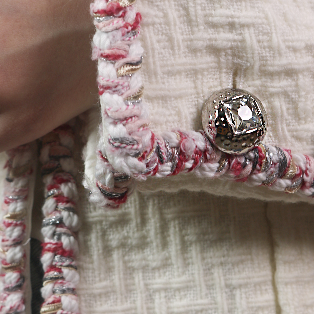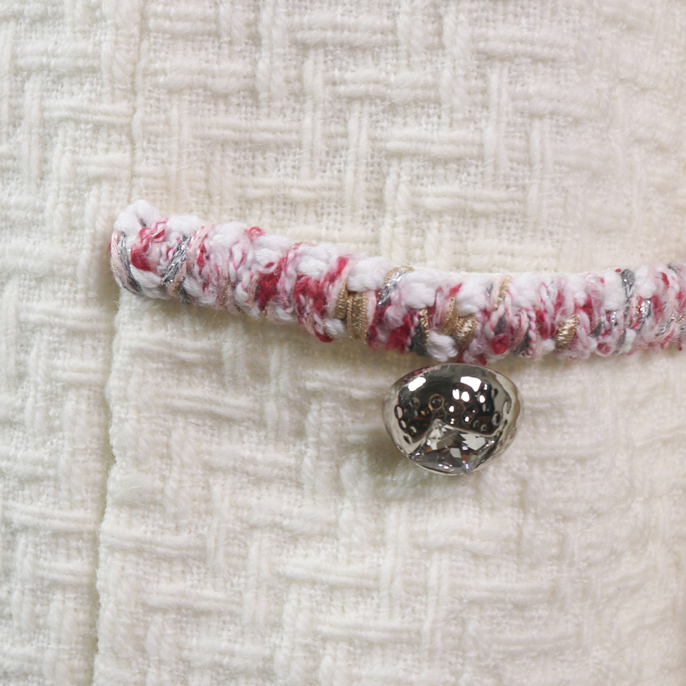 【snow】純白のウールツイードを使用し、柔らかく肌触りの良い質感が、冬に温かく贅沢な雰囲気を表現します。鮮やかなフューシャの手編みリボンがコントラストを添え、純白のベースカラーと調和し、ヴィンテージな冬の頌歌を奏でます。すべて手縫いで仕上げられたリボンが、この芸術作品を完成させます。世代を超えて受け継がれる価値のあるウールコートです。