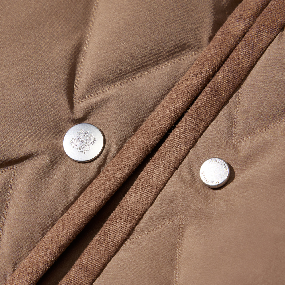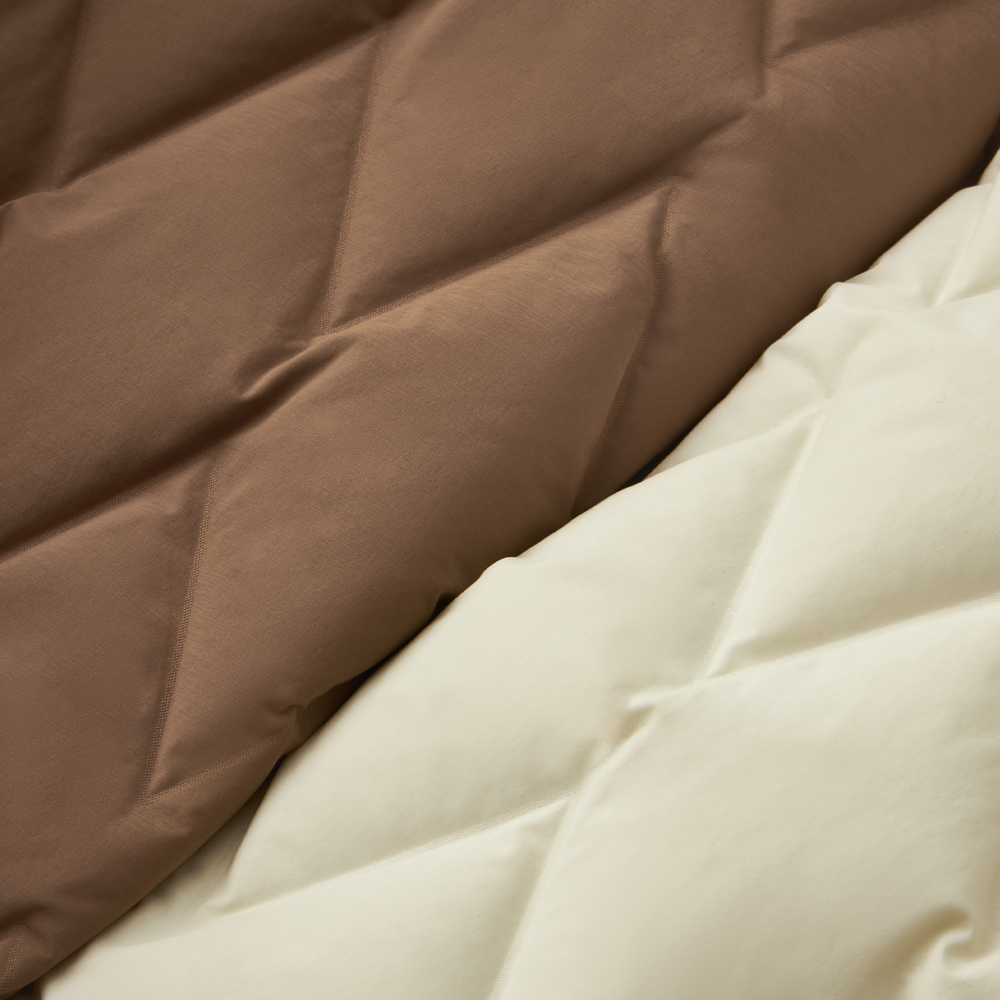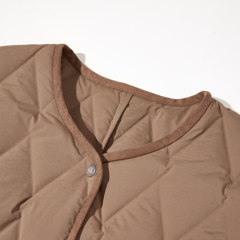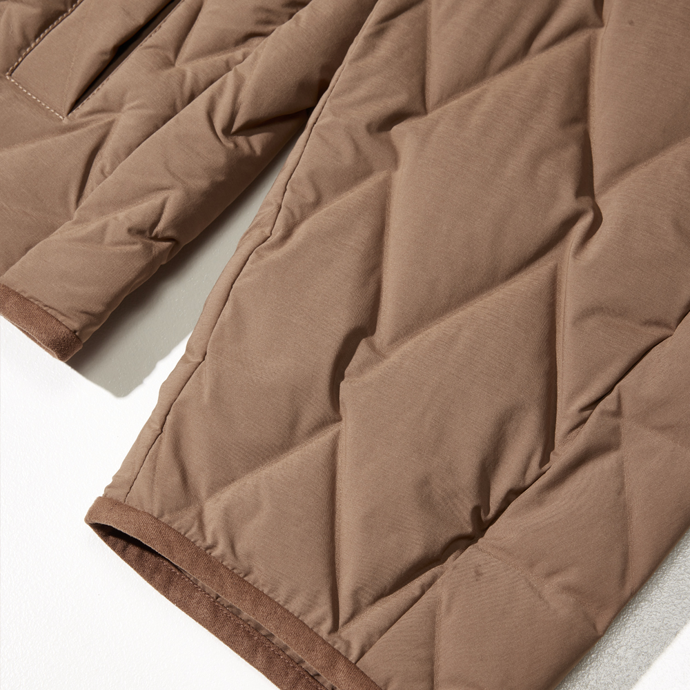 【裏地】国家新基準のホワイトダックダウン充填材は、アヒルの胸部と腹部から選別した大房のダウンを使用しています。この大房のダウンは、球状繊維に無数の小さな三角形の気孔があり、温度変化に合わせて伸縮し、温度を調節して暖かさを保ちながら冷気を遮断します。雲のように軽く、純白で鮮やかな色で、肌に軽くて快適な着心地。37℃の雲のように柔らかく、肌に優しい着心地を実現します。