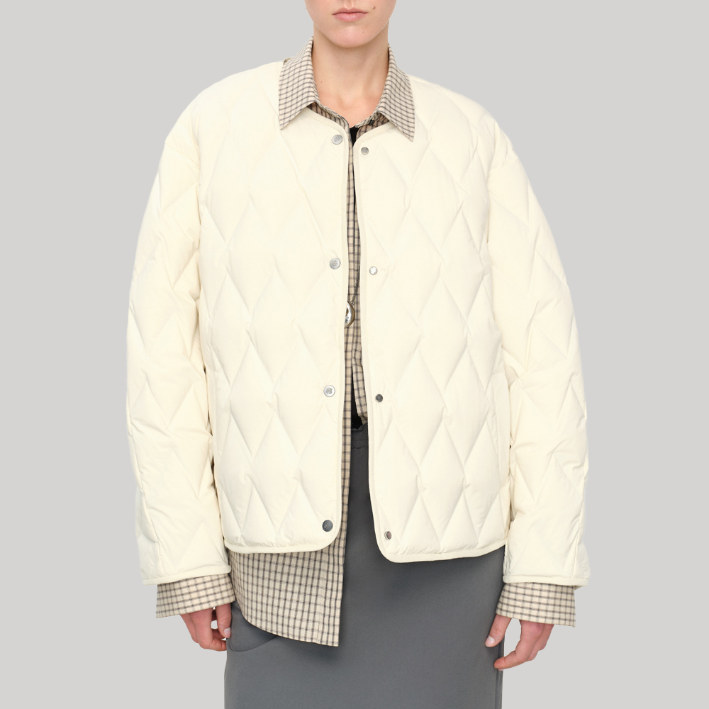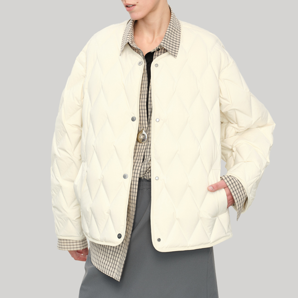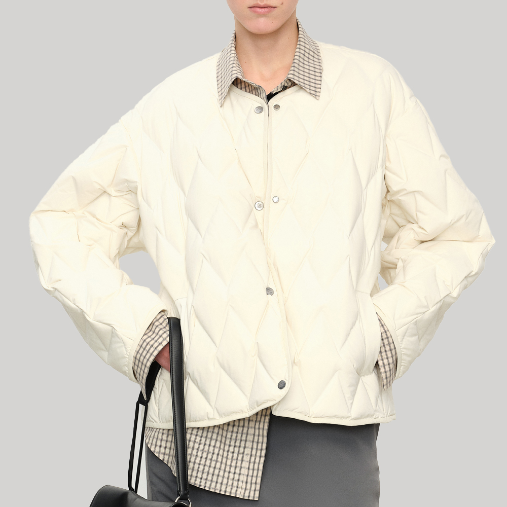 【デザインの詳細】1. VTGミニマリストルーズフィットドロップショルダーショートダウンジャケット。黄金比を生み出す豊かなシルエットで、小柄な体型を引き立て、普段着に適しており、常にシャープでスタイリッシュな外観を維持します。2.繊細なVネックのディテールを備えたノーカラーデザイン。同色のシングルラインエッジが「トレース」効果を生み出し、首を長く見せます。3.デュアルスラントサイドポケットは暖かさを提供し、スタイリッシュなタッチを加えます。4.トレンドのBVチェックキルティング。クリーンでシャープなラインと細かいステッチでダウンの漏れを防ぎます。5.多層電気メッキプロセスを備えたカスタムロゴスナップボタン。繰り返し着用して洗濯しても酸化しません。