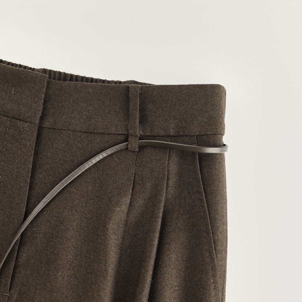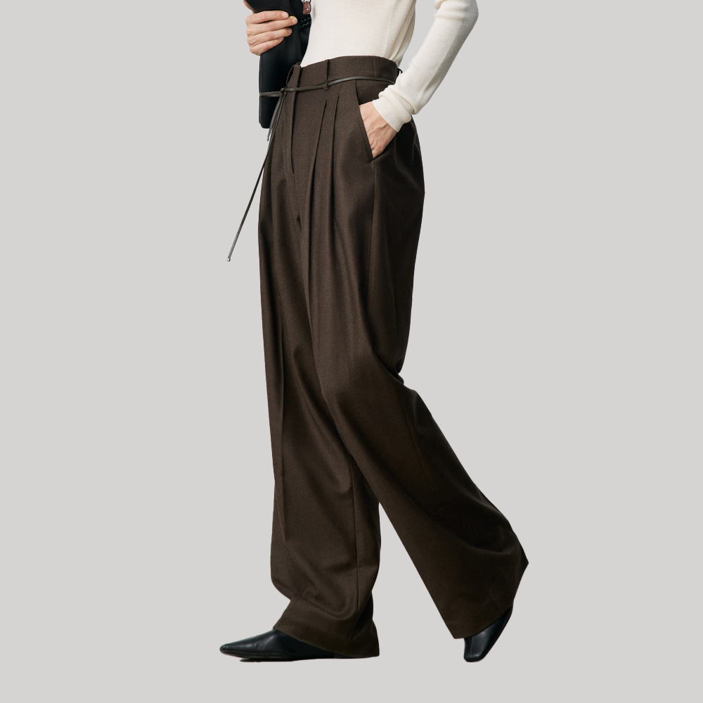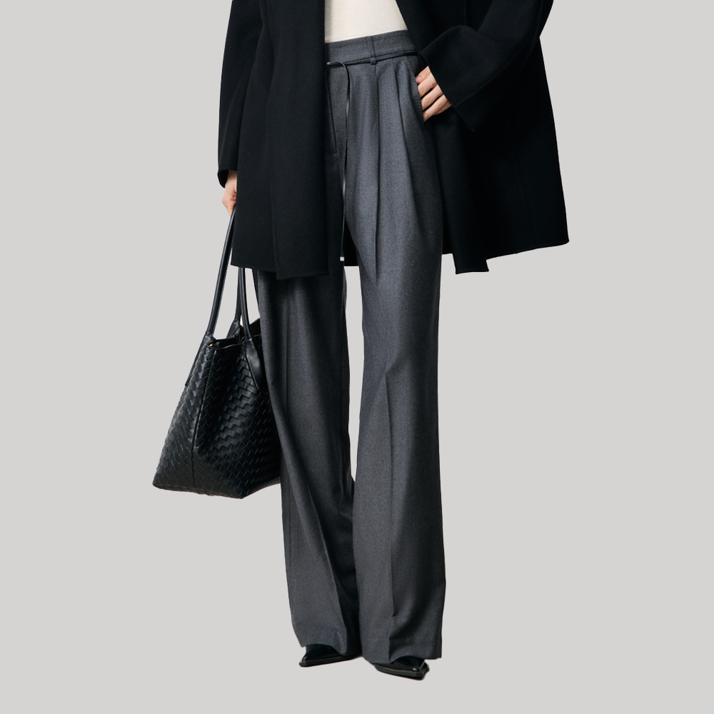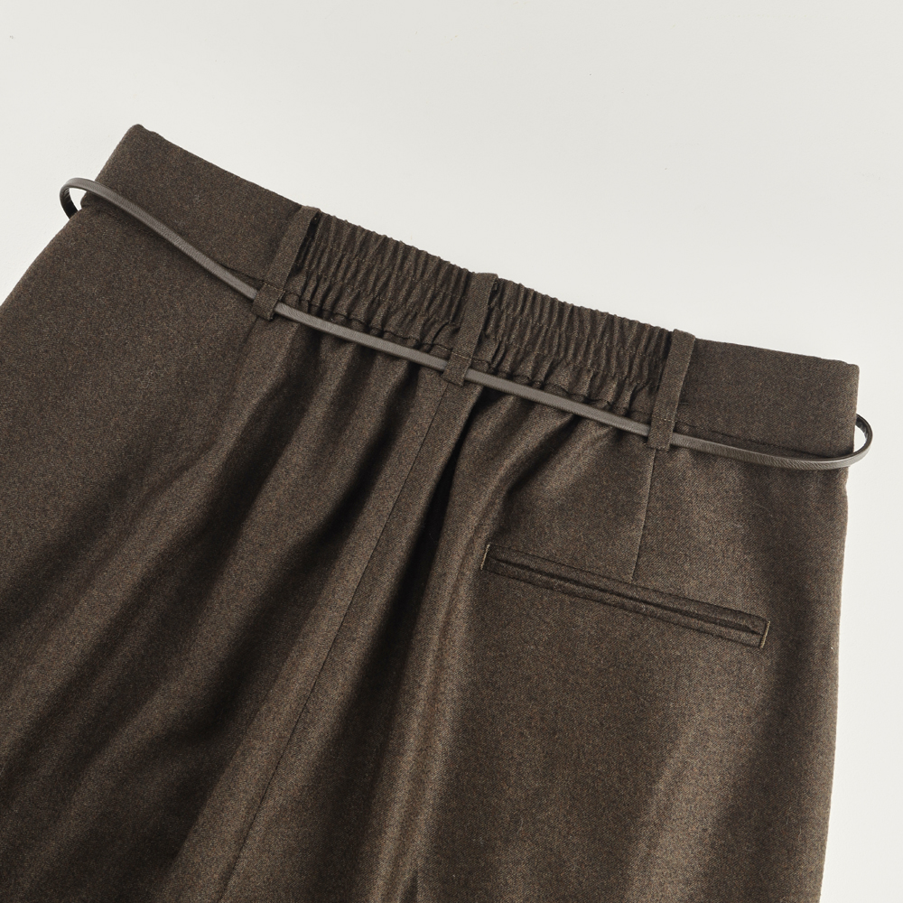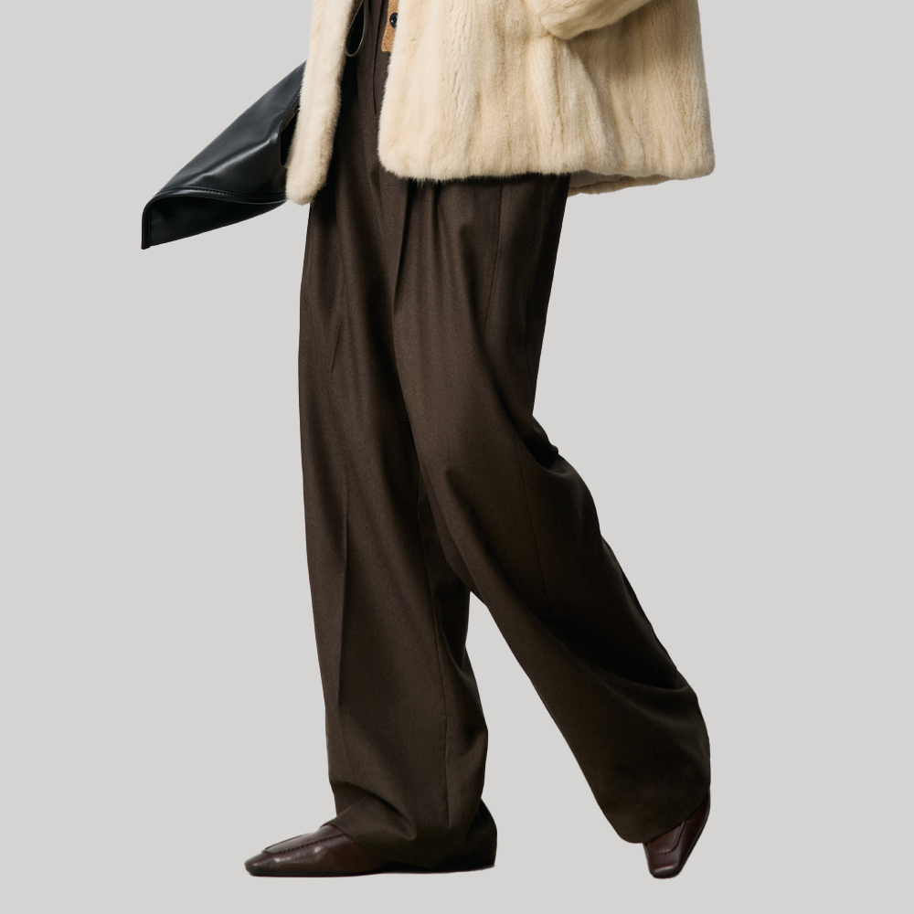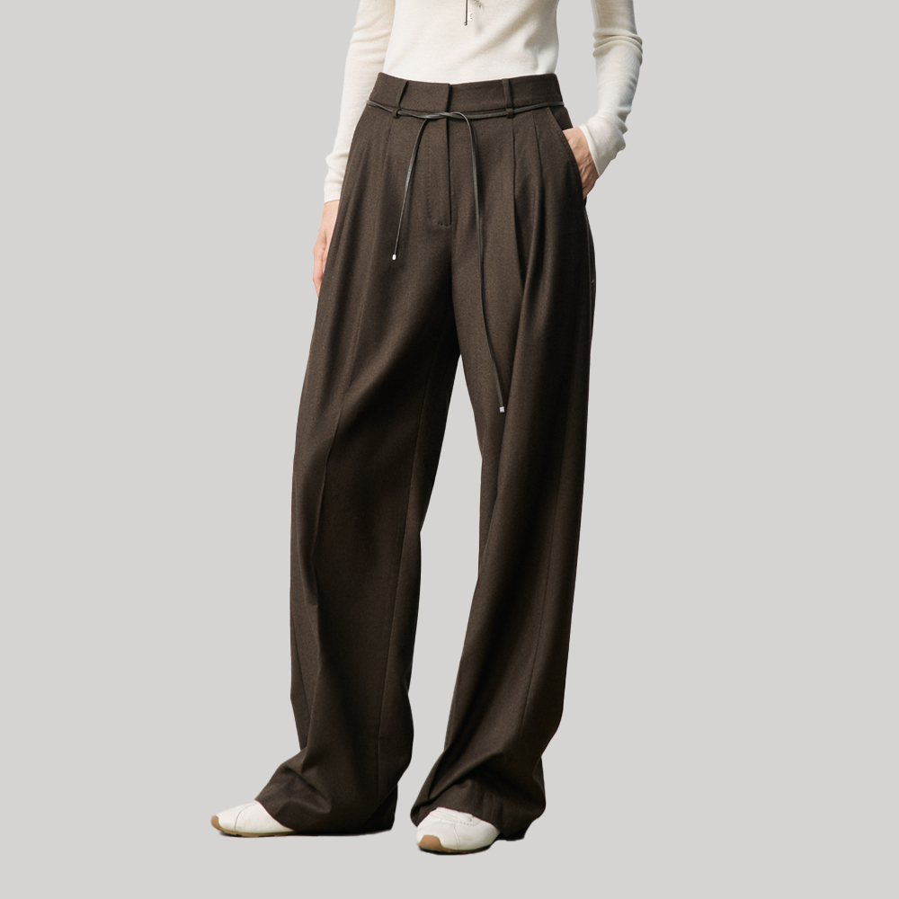 【デザインの詳細】 1. MAXM*RAの最新の2026年秋冬ランウェイダブルプリーツワイドレッグパンツは、きれいなダブルプリーツ、完璧な長さと脚の周りが特徴で、さまざまなコートやジャケットとよく合います。 2. ダークグレーとブラック、またはブラウンにブラウンがかったグリーンのアクセントが付いた、洗練された雰囲気のマリウスロゴ入りカスタムメイドレザーベルトが付属します。 4. 前立てとポケットに施された絶妙なカラーマッチしたキルティングが職人技を際立たせています。5. フロントパネルは体にフィットし、背面には伸縮性のあるウエストバンドが付いており、オフィスでの快適さとスタイルの両方を実現します。6. 背面の非対称ダブルリップポケットデザインが体型を美しく見せます。7. カスタムメイドの輸入YKKジッパーは、スムーズな操作を保証し、国際的な品質を実証しています。8. 色を合わせた伸縮性のある柔らかいツイルコットンの裏地は、秋冬に最適で、肌に柔らかく快適で、摩擦を軽減し、快適さを高めます。