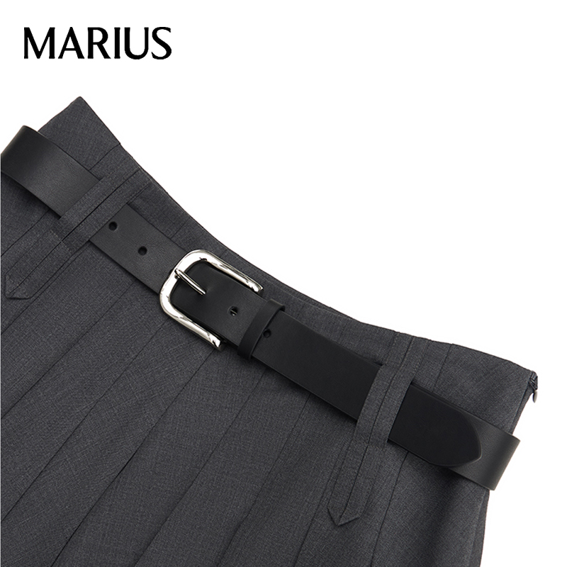3. ウエストバンドには剣型のバックルがあしらわれています。付属のブラックマイクロファイバーレザーベルトは、メタルバックルとしっかりとした質感で、ウールの柔らかな質感とのバランスを取り、よりダイナミックでスタイリッシュな印象を与えます。